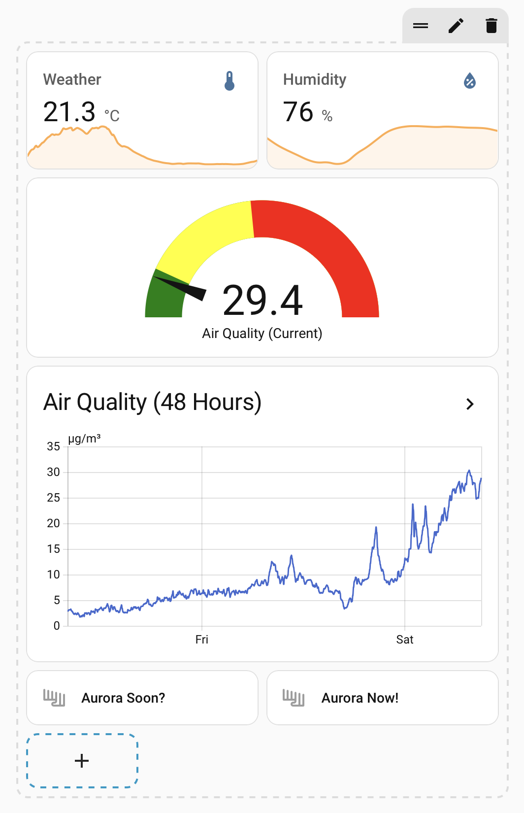 I applied for an API key via the previous link and it arrived straight away (Well, not quite - I applied three times and the first two times I never received anything, so worth trying entering email addresses from different providers if you find yourself in the same position). Now in the section of my dashboard that shows the conditions outdoors, I’ve set up two little cards showing if there’s a current “Aurora Watch” notice, which has up to a 48 hour lead time of whether there are likely conditions soon for Auroral activity, and one for if there an “Aurora Alert” in effect, which is when “space weather activity favourable for viewing aurora is in progress”, as they put it. I configured them to only appear when active, hence the below Home Assistant screenshot showing “Edit” mode.